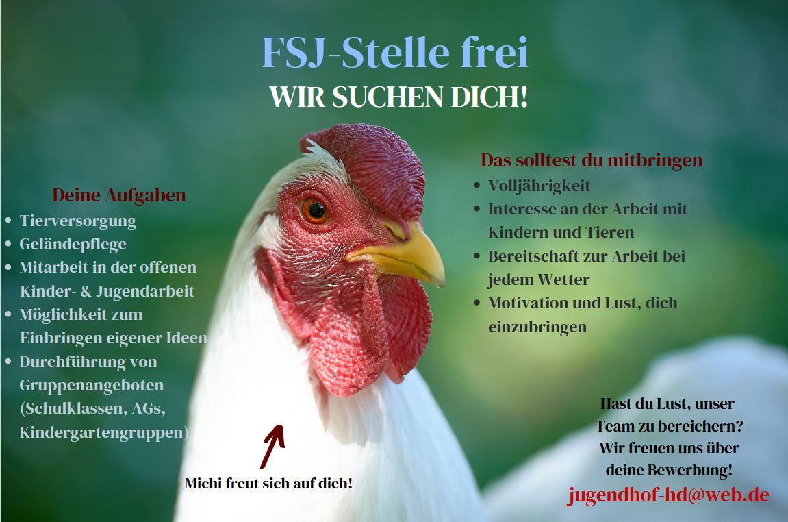 Zu euren täglichen Aufgaben in der Tierversorgung gehören u.a. das Zubereiten des Futters für die Tiere, die Fütterung der Tiere und das Ausmisten der Stallungen. Bei Planungen für pädagogische Angebote freuen wir uns über aktive Beteiligung und neuen Input. Auf dem Jugendhof kann jede/r seine/ihre Stärken und Interessen einbringen: kreativ-handwerkliches Arbeiten, beim Tischkickern oder coolen Outdooraktivitäten. Zur Hof- und Geländepflege gehören zum Beispiel Fegen der Wege, Laub rechen und Zäune instandhalten.