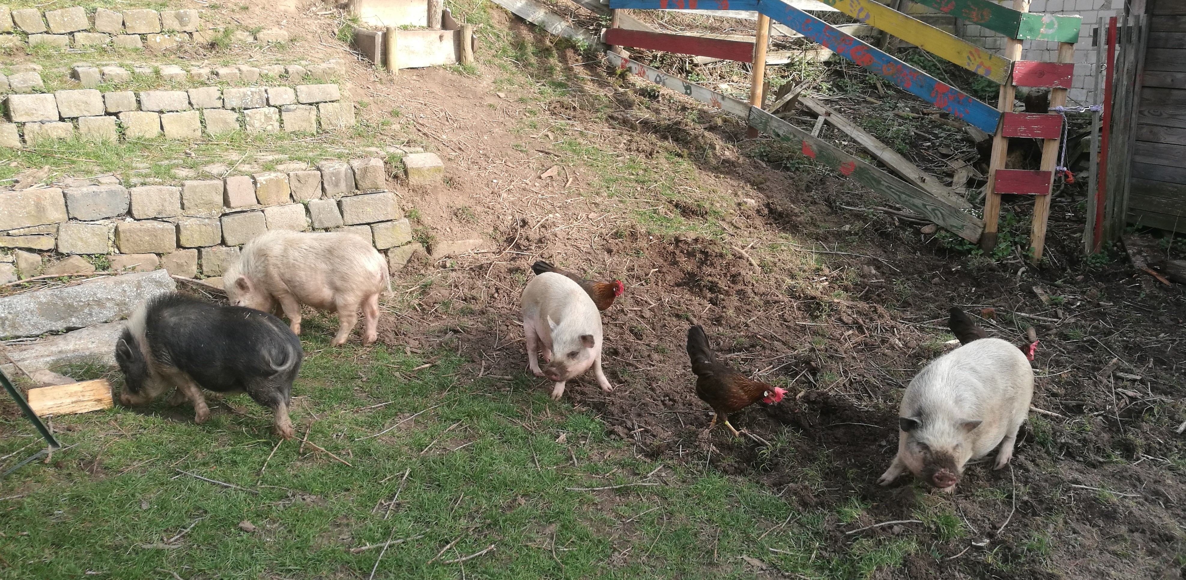 Vorheriges Bild Nächstes Bild dav Unsere Neuzugänge haben schon Freundschaft mit den Hühnern geschlossen.